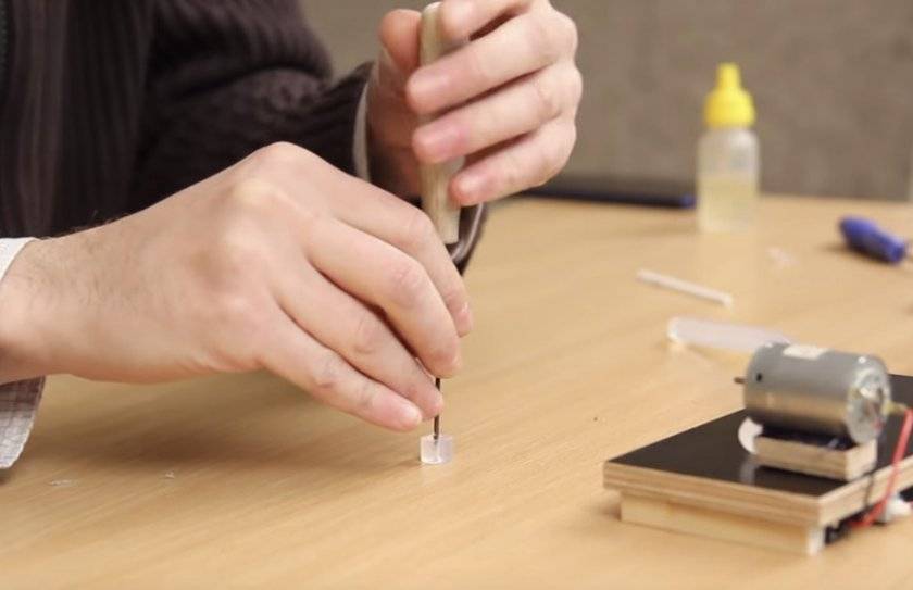Изготовление эксцентрика. От палочки термоклея отрезать небольшой кусочек шириной 8 мм. При помощи шила сделать по центру отверстие и аналогичное отверстие сбоку. Небольшой кусочек проволоки установить в боковое отверстие, чтобы получился самодельный эксцентрик. Данное приспособление насадить на вал моторчика.