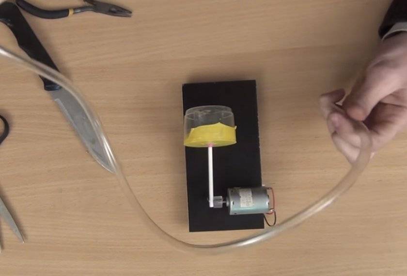 Самодельный аэратор готов. Для подачи кислорода необходимо конец трубочки опустить в воду и включить прибор. Принцип его работы очень простой: моторчик, проворачиваясь, тянет за собой мембрану, и через клапан в крышку поступает воздух.