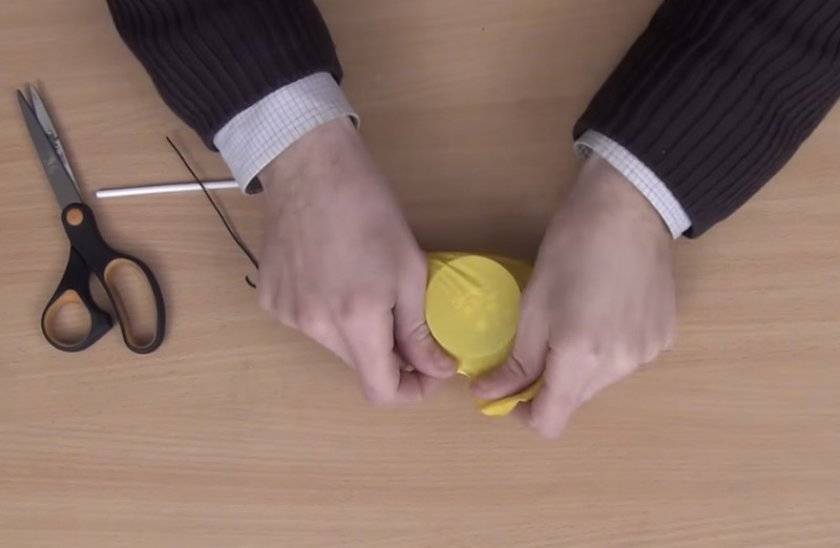 Изготовление барабана. Разрезанный шарик натянуть сверху крышки таким образом, чтобы получился своеобразный барабан. Шарик зафиксировать при помощи скотча по всей окружности. Ножницами обрезать остатки.