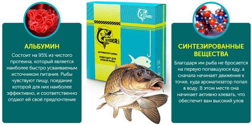 Высокая эффективность этого привлекающего средства объясняется тем, что быстро растворяется в воде и способно привлекать рыбу с большой дистанции. Ощутив запах альбумина и искусственных феромонов, рыба моментально устремляется к привлекающему её аромату и хватает наживку. Такой принцип действия аттрактанта можно считать наиболее эффективным.