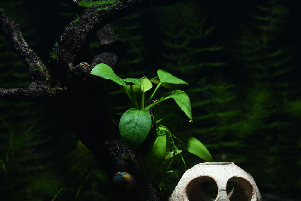 Необычен способом выращивания – полностью погруженным, с приживлением к коряге. Такое интересное решение помогает облегчить аранжировку, сделать дизайн аквариума разнообразнее, используя и горизонтальное, и вертикальное озеленение.