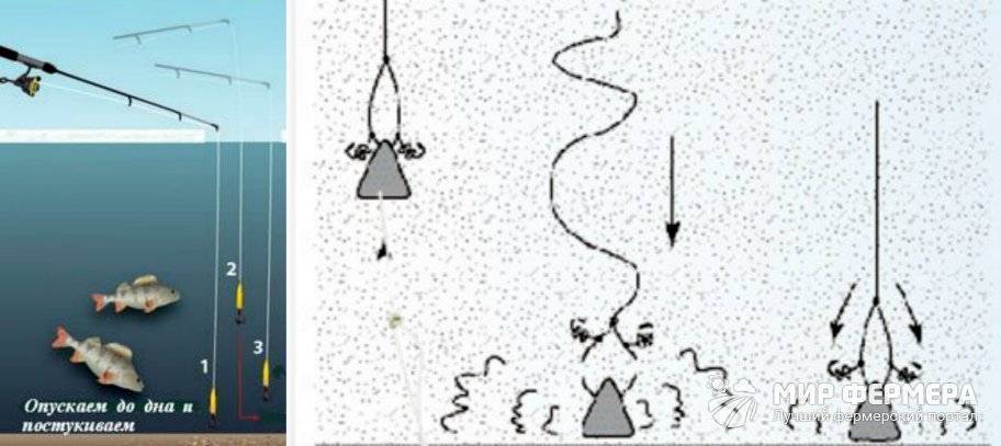 Когда грузило поднимется, к нему следует прижать крючки и опустить приманку на дно водоема повторно.