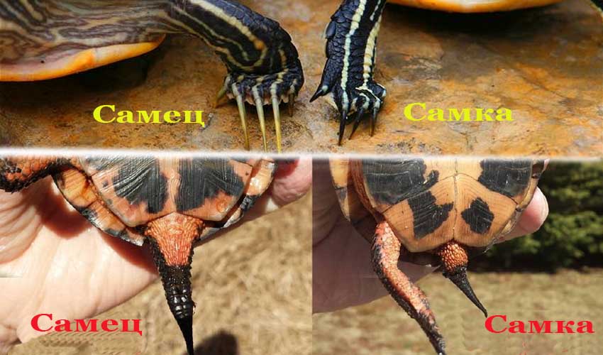 Все маленькие рептилии до старта полового созревания выглядят как самки. У взрослых черепах можно выделить различия в коже, когтях, размере головы, форме панциря и других частях организма.