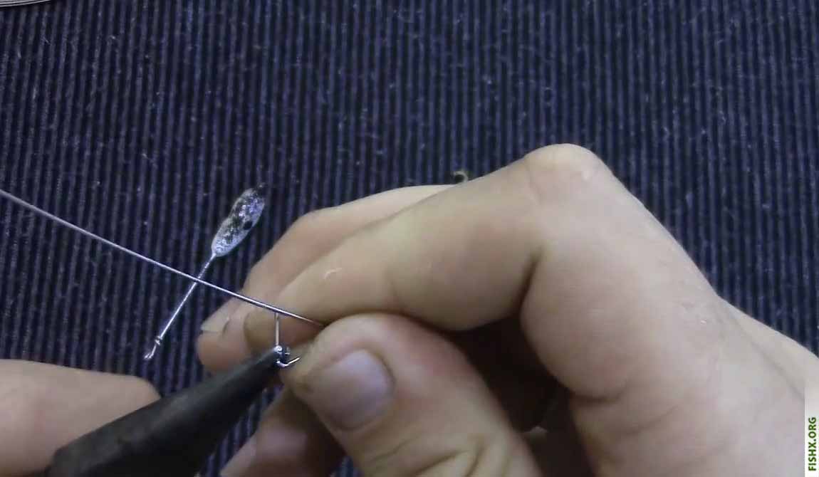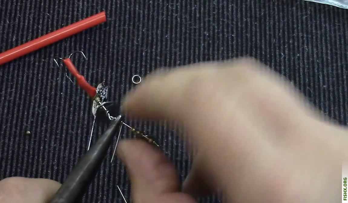 Лишнее откусываем кусачками. Теперь нам осталось одеть через заводное кольцо свинцовую огрузку. Разводим заводное кольцо пинцетом