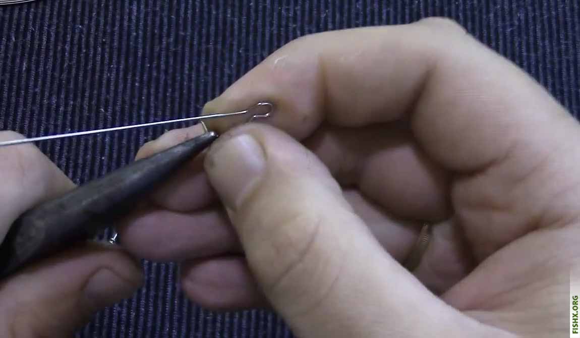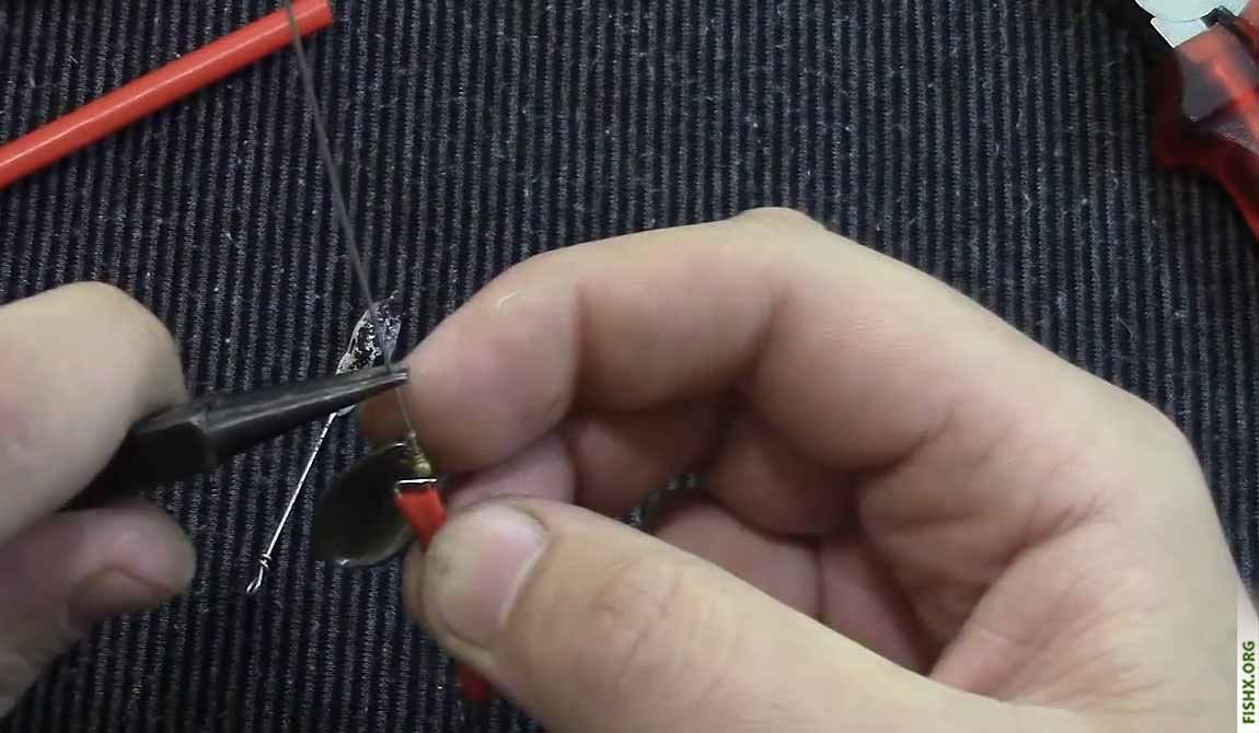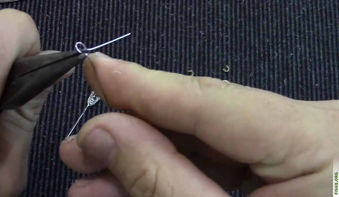 Начинаем формировать вращающуюся блесну при помощи круглогубцев петельку для тройника.