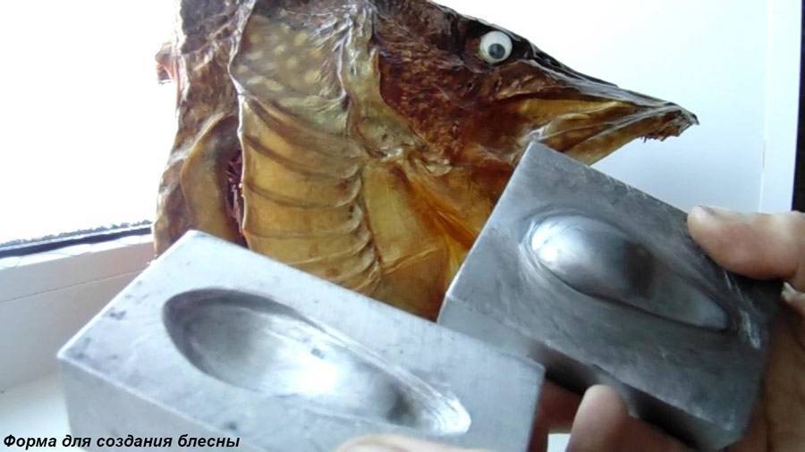 ?з латунных или медных заготовок вырезается симметричная овальная или ромбовидная пластинка в виде рыбки-уклейки средних размеров, с отверстием для лески. Выдавливанием или чеканкой пластинке придается необходимая форма с нужными изгибами. Одна сторона пластинки покрывается паяльным припоем, крепящим крючки и утяжеляющим блесну. Вторая сторона тщательно шлифуется. В качестве заготовок можно использовать литые или выточенные болванки, и тогда процесс изготовления блесны будет заключаться в просверливании отверстий и креплении крючков.