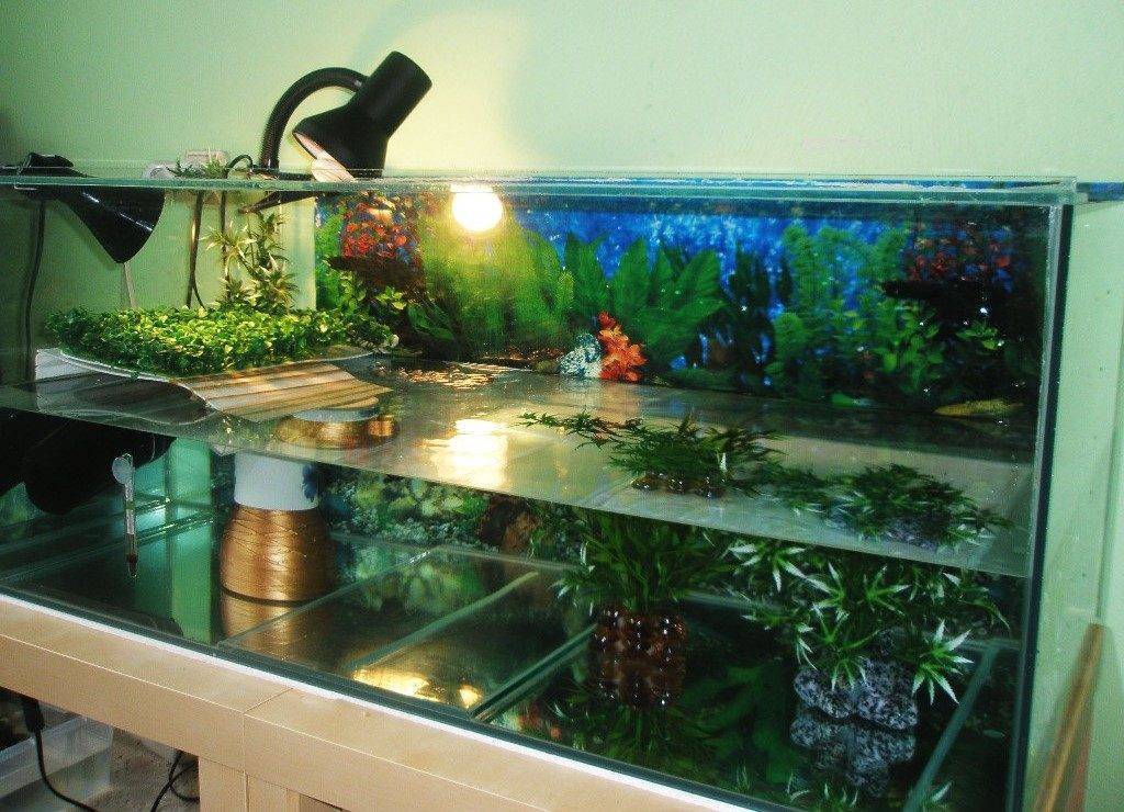 Обеспечить островок лучше для каждой особи. Если в аквариуме живет пара (самец и самка), его емкость должна быть не менее 200 литров. Тогда желательно сделать 2 островка и поставить минимум 2 лампы накаливания, чтобы каждый питомец чувствовал себя комфортно и не дрался за место «под солнцем».