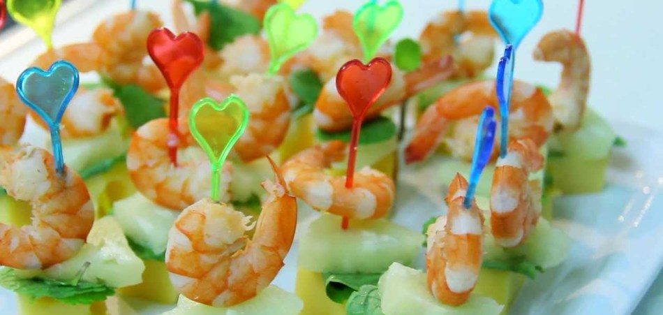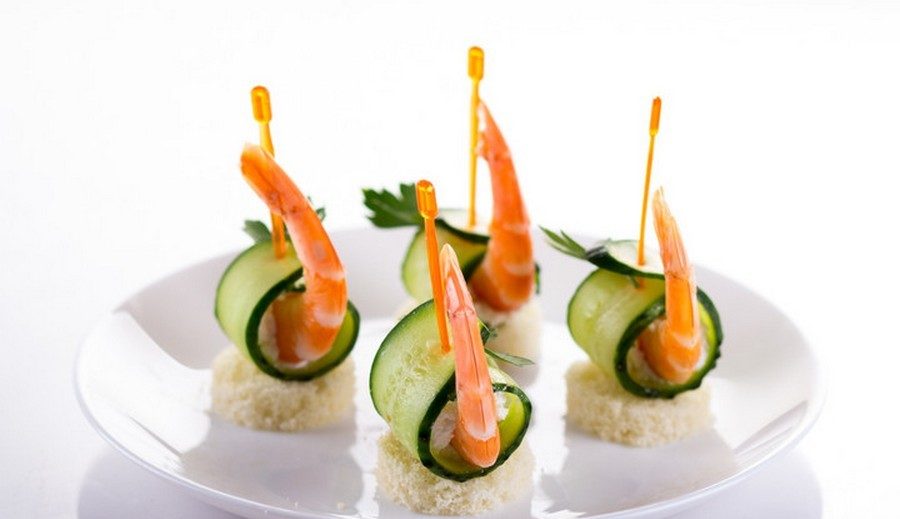 Или можно сделать такие виды закуски, используя креветки, помидоры и огурцы: