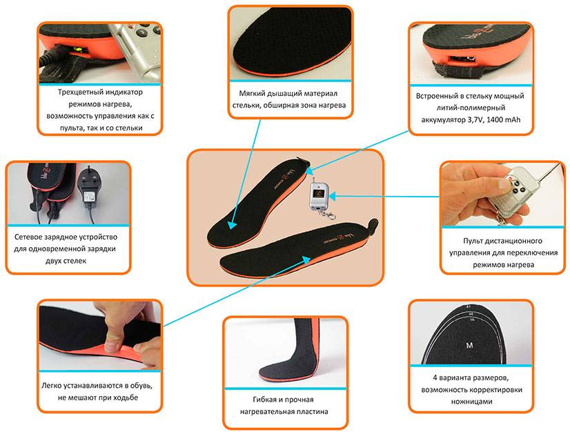 Сама стелька выполнена из материала, который сохраняет тепло, не пропускает влагу и достаточно пластичен, чтобы подстраиваться под стопу человека. Различные модели стелек с подогревом могут оснащаться пультом управления или питаться не от аккумулятора, а от сменных батареек. Таким образом, получается, что это многоразовые согревающие стельки для ног.