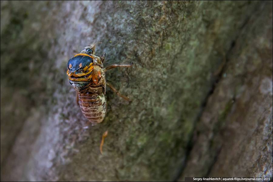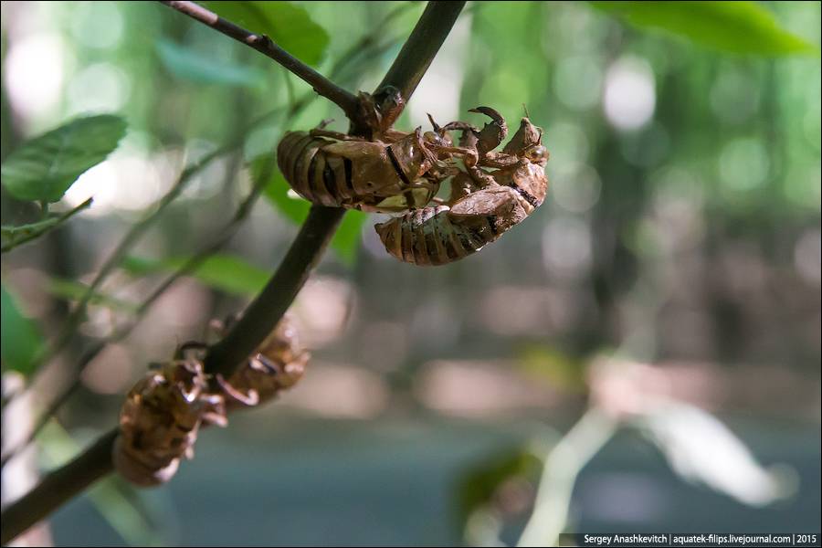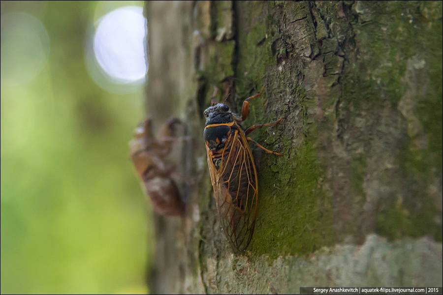 5. У цикад очень необычный жизненный цикл, о котором стоит рассказать подробно.Цикады откладывают яйца под кору тонких веточек или в черешки листьев. Самка при этом надрезает кору пильчатым яйцекладом, в результате чего кончики ветвей или листья засыхают. Личинки по выходе из яиц падают на землю и зарываются в почву, где и протекает их дальнейшее развитие. У разных видов цикад личинки зарываются на разную глубину, иногда более 1 м. В земле они питаются корнями деревьев и трав. Тело личинки беловатое с очень мощными передними копательными ногами. Под землей личинки делают вокруг себя колыбельку с уплотненными стенками и сидят там, в зависимости от вида, от 2 до 17 лет.А затем однажды летом, одновременно пробив путь на белый свет, выползают из своих нор…В этом лесу нам повезло увидеть не обыкновенных певчих, эти под землю сидят “всего” 4 года, а периодических цикад (Cicada septemdecim), которые предыдущий раз появлялись здесь со своим пронзительным скрипом далеких 17 лет назад.