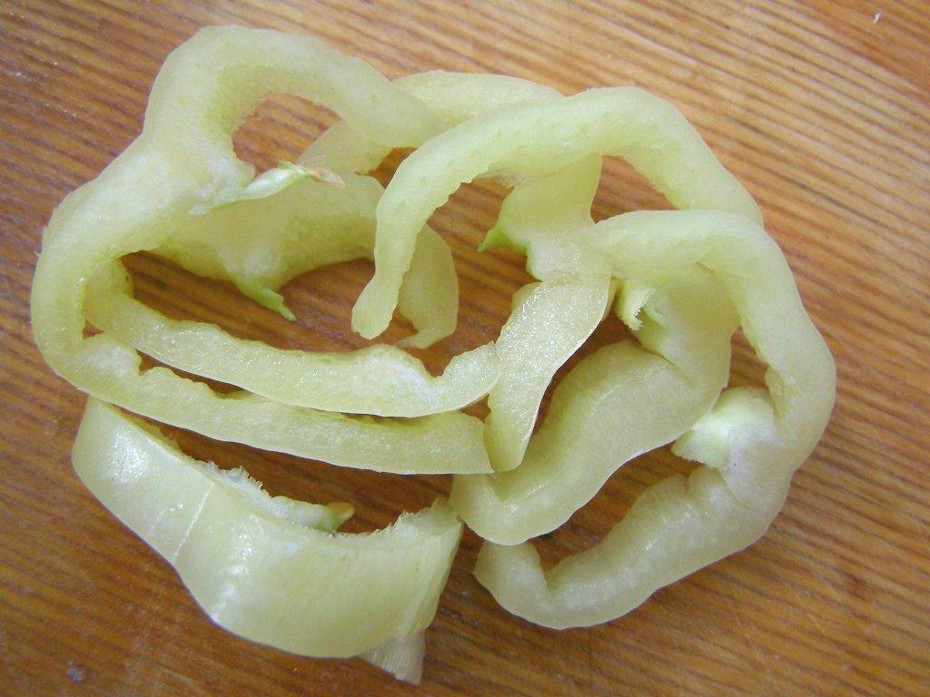 - Картофель требуется нарезать в виде тонкой соломки, добавить к нему молотый перец (1/2 часть), соль (3-5 г) и майонез (50 мл), перемешать компоненты.