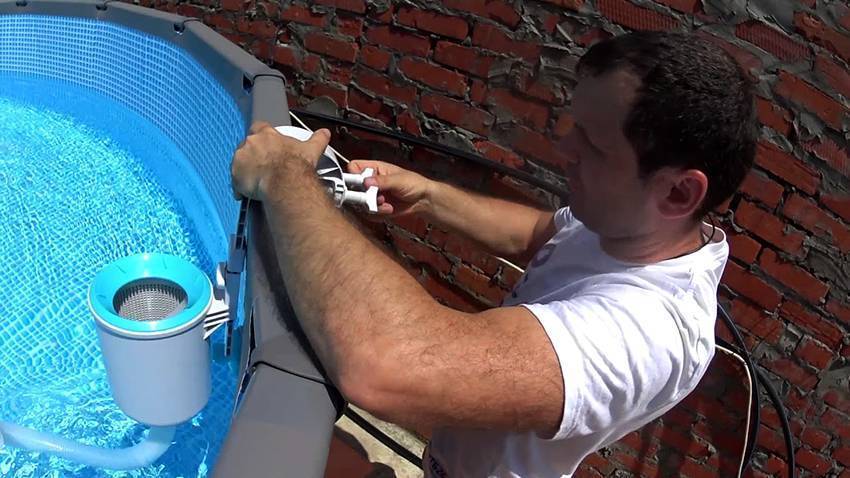 - Подключение. Присоединение трубки скиммера к насосу. При этом трубку проводят через клапан, который проделан в стене бассейна.