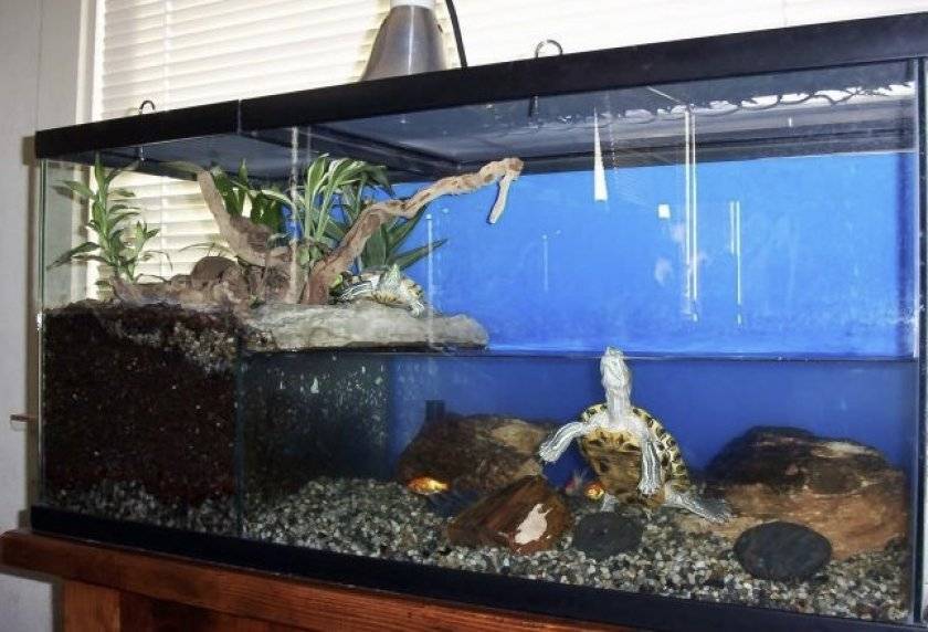 Аквариум лучше брать просторный. Минимальный объем для проживания одной взрослой особи — 50 л. Внутри обязательно должны присутствовать вода и покатый берег. Несмотря на то, что черепашки много проводят времени в воде, иногда они все же гуляют и по берегу.