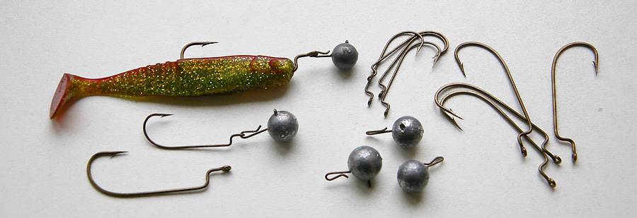 Если ловля хищника будет происходить на чистых участках водоёма, то в качестве крючков можно использовать простые модели с длинным цевьём. При ловле среди коряг или на замусоренном дне подойдут офсетные крючки. Также для монтажа оснастки существуют специальные крючки, имеющие две точки опоры, что позволяет крючку располагаться перпендикулярно леске.