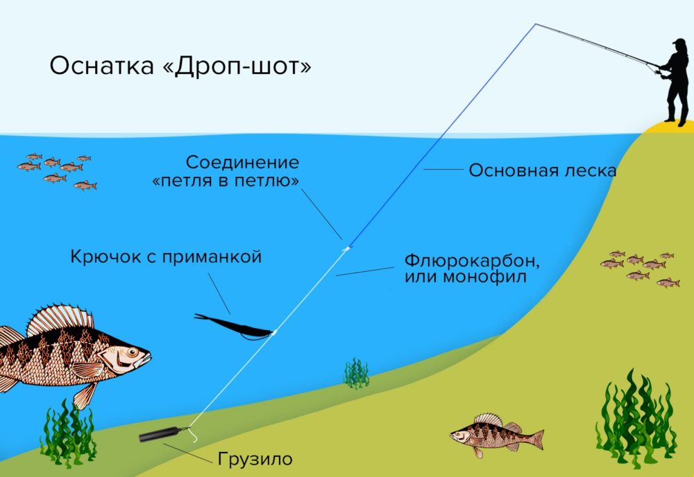 Дроп шот представляет собой разновидность разнесенной оснастки, у которой грузик вынесен за пределы приманки, а она сама располагается выше огрузки на основной леске. Такой вариант монтажа определяет поведение приманки при проводке, назначение оснастки и особенности ее использования.