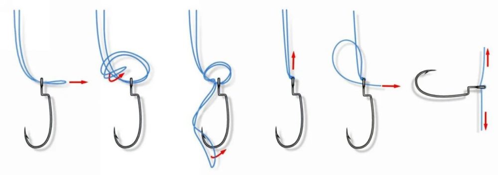 - Крючок привязывают в 30-70 см от груза. Расстояние зависит от того, на каком уровне ото дна должна идти приманка. Крепление крючка в большинстве случаев производится узлом «Паломар». Этот тип крепления способствует перпендикулярному расположению приманки по отношению к леске.