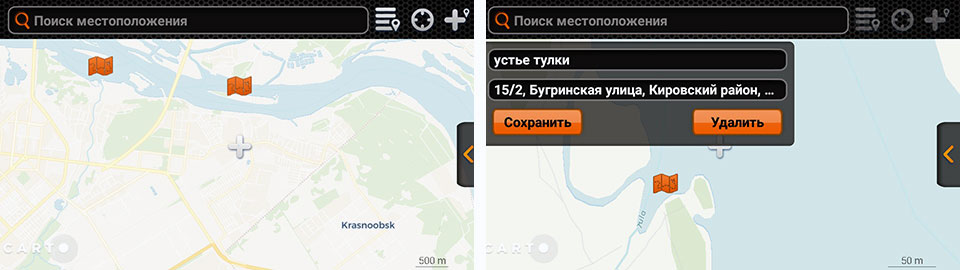 Во вкладке «карты» будут отображаться ваше местоположение и все отмеченные ранее точки.