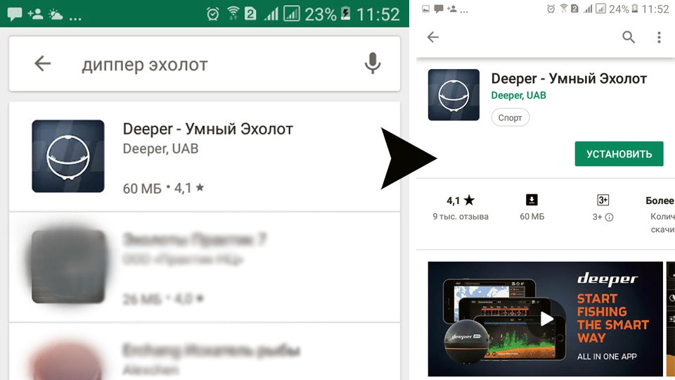 Для начала со смартфона нужно зайти в “Плеймаркет”, затем найти и скачать приложение «Deeper-умный эхолот». Его можно найти с помощью голосового помощника или ввести в поле поиска слово «диппер» – все очень просто, даже для человека не сильно разбирающегося в девайсах. Объем памяти данное приложение занимает не так много, всего 60 МБ. Со скачиванием и установкой приложения справился даже мой знакомый пенсионного возраста, которому я давал эхолот попользоваться. Все интуитивно понятно и просто в освоении! На фото все показал наглядно!
