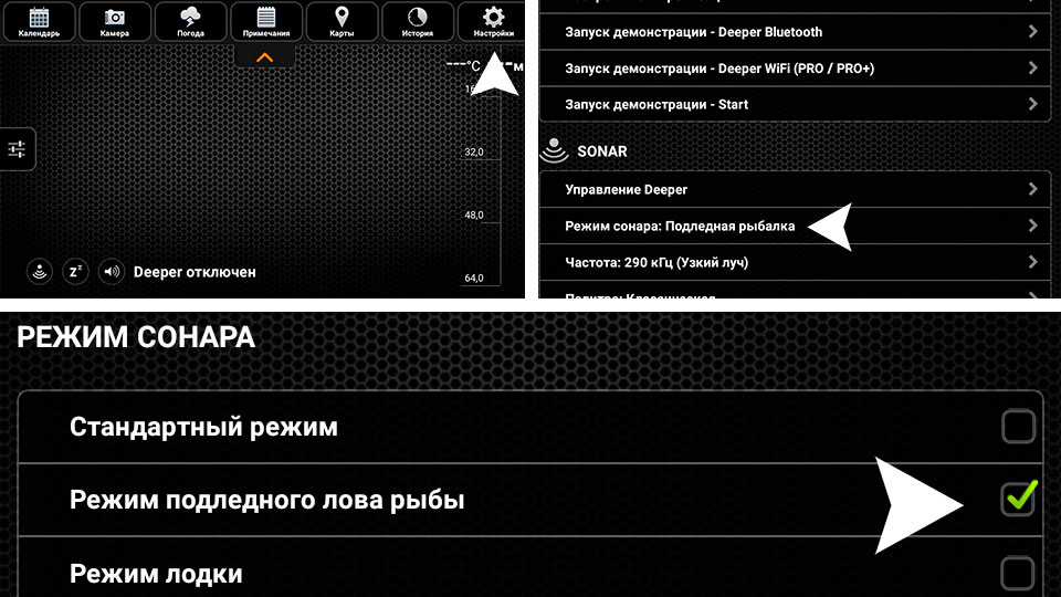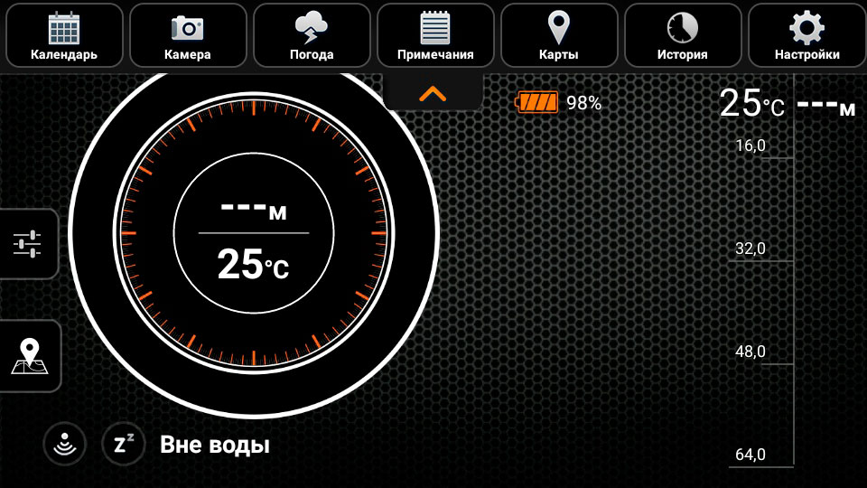 Настройки сохраняются, и при следующем включении приложение уже изначально начнет работу в данном режиме. Справа на рабочем столе отображается глубиномер и указатель температуры воды, также эти данные дублируются в середине «круга-глубиномера». Слева для удобства есть вкладка быстрого доступа к некоторым настройкам. В этой вкладке можно выбрать чувствительность и включить «зум». Пока эхолот не в воде, внизу экрана горит надпись «Deeper отключен» или «Вне воды». Как только эхолот погрузили в воду, на экране начнут появляться показания. Кратко пробежимся по остальным вкладкам верхней панели.