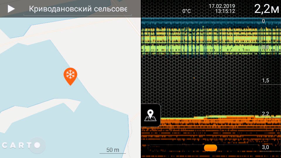 Приезжая на незнакомый водоем, забрасываем сонар в воду, достаем айфон, спариваем по Bluetooth и делаем разведку обстановки. Ага, у самого дна пасется стая рыб…