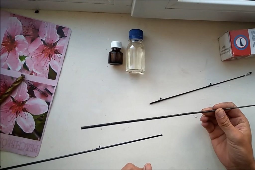 Случается, что при осмотре удилища обнаруживаются царапины и небольшие потертости. В этом случае необходимо взять водостойкий лак и нанести несколько тонких слоев на проблемные участки. После нанесения первого слоя ждем, чтобы он высох. Для ускорения процесса можно просушить лак феном.