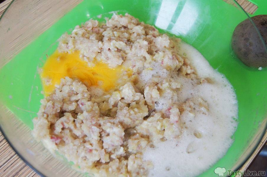 - Мякоть щуки перемолоть вместе с обжаренным луком и хлебом, добавить желток, манную крупу, молоко, соль, перец и мускатный орех. Хорошенько вымешать.