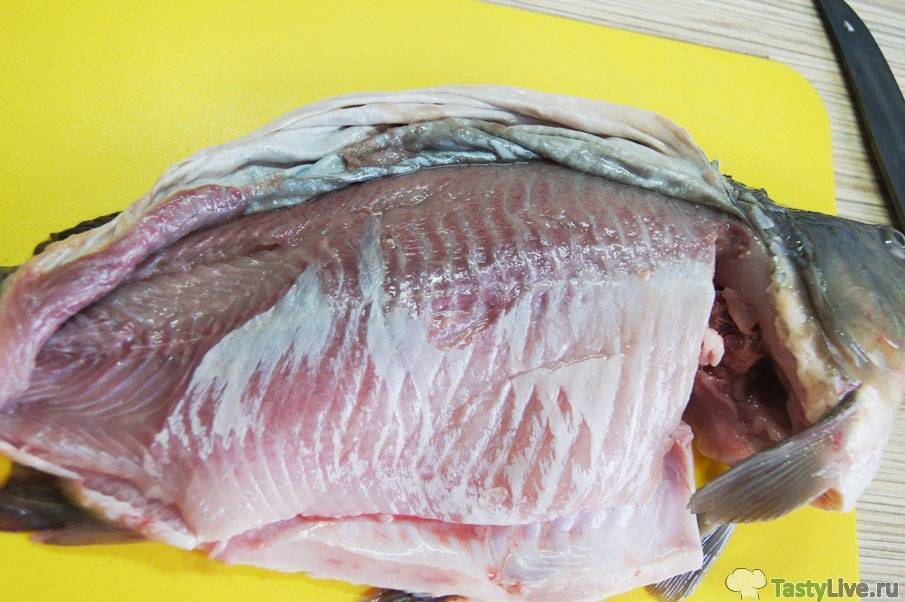 Разделайте карпа так, чтобы не разрезать брюшко. Голова и хвост пригодятся.