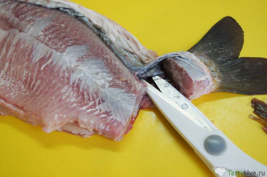 - Рыбу помыть, очистить от чешуи, отрезать хвост и голову.