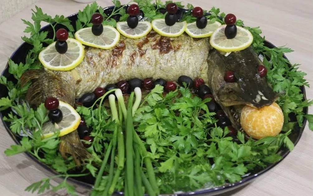 - Готовую рыбу достаньте из духовки, бульон слейте. Дайте щуке остыть, переложите на блюдо и украсьте соответственно случаю. Подавайте холодной.