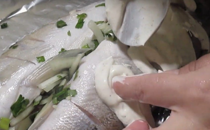 - Противень застилаем фольгой и кладём на него рыбу. Измельчённый лук, чеснок и петрушку размещаем внутри рыбы. Рыбу приправляем солью по вкусу.Полукольца лимона вставляем в разрезы на рыбе. Рыбу покрываем 100 г майонеза.