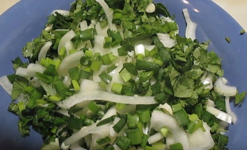 3. Чеснок мелко нашинкуйте, измельчите перья зелёного лука и кинзу. Посолите, перемешайте в тарелке с репчатым луком и пока отставьте в сторону.