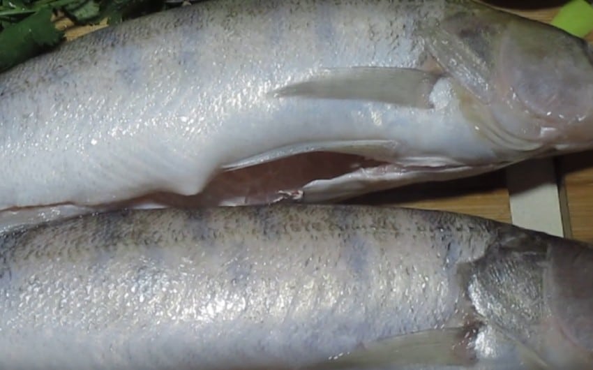 Для этого отрезаем от нее плавники, голову и жабры. Вынимаем внутренности, стараясь их не повредить. Затем промываем тушку под холодной водой и разрезаем на порционные кусочки.