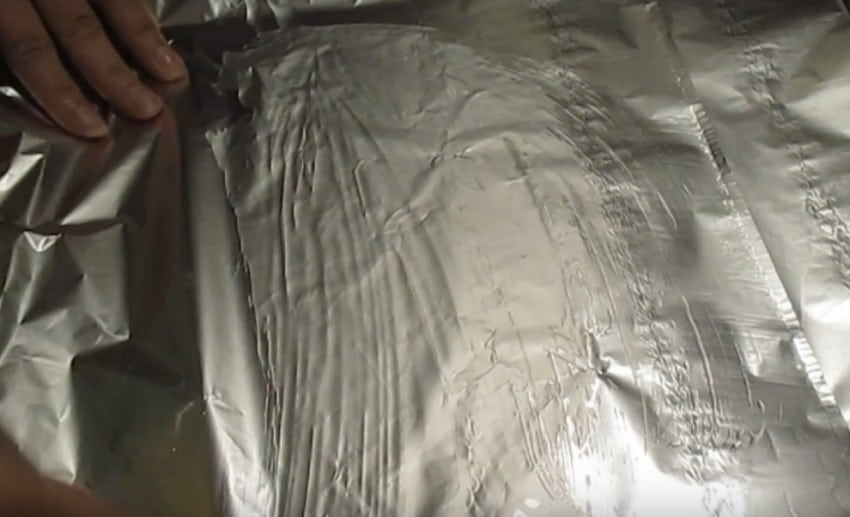 Кухонная утварь: фольга, нож, разделочная доска, противень, ложка.