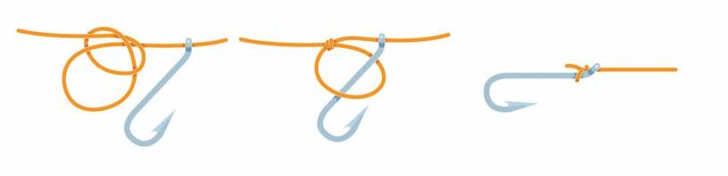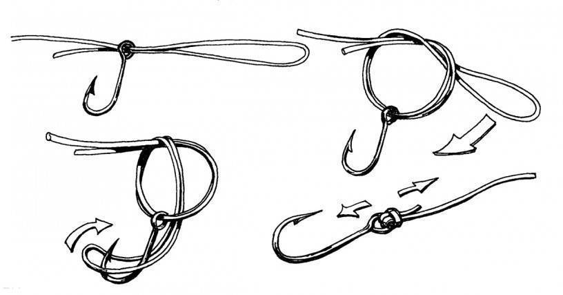 Этот простой рыболовный узел подойдет для того, чтобы надежно привязать крючок к плетенке (диаметр — не менее 0,2 мм). Более тонкая оснастка выскользнет. Узел сохраняет до 75 % прочности лески.