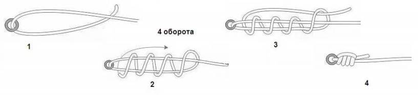 Сложно вяжется, но сохраняет до 85 % прочности оснастки. При формировании следите за тем, чтобы витки ложились ровно. Подходит для привязывания крючков и грузил к любым по толщине плетенкам и мононитям.