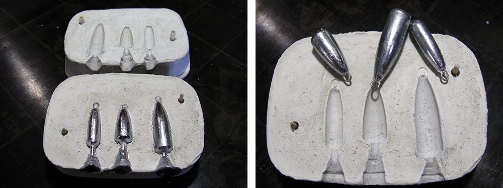 Если же за материал для грузил будет взят свинец, изготовленная форма для литья выдержит примерно 8-10 отливок. Также стоит отметить, что с каждым разом свинцовое грузило будет всё больше отдаляться от изначального идеала по причине постепенного выгорания формы з герметика.