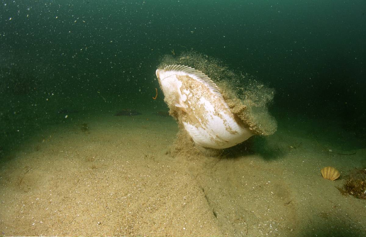 Камбала (морская) зарывается в песок таким удивительным образом, что ее совершенно при этом не видно, а на поверхности остаются лишь глаза. И делают это они очень быстро. При помощи волнообразных движений телом они поднимают песок, затем опускаются на дно, а на них оседает ил, укрывая их сверху.