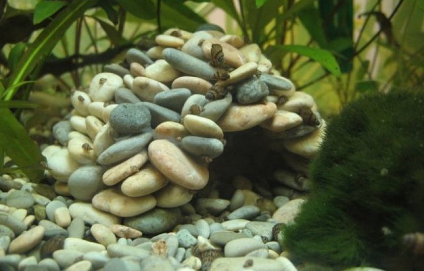 Для создания потребуются плоские гладкие камушки, например, галька и аквариумный силикон. Камни приклеивают друг на друга, создавая полусферу. Не следует тщательно подгонять камешки – небрежность придаст декорации естественный вид