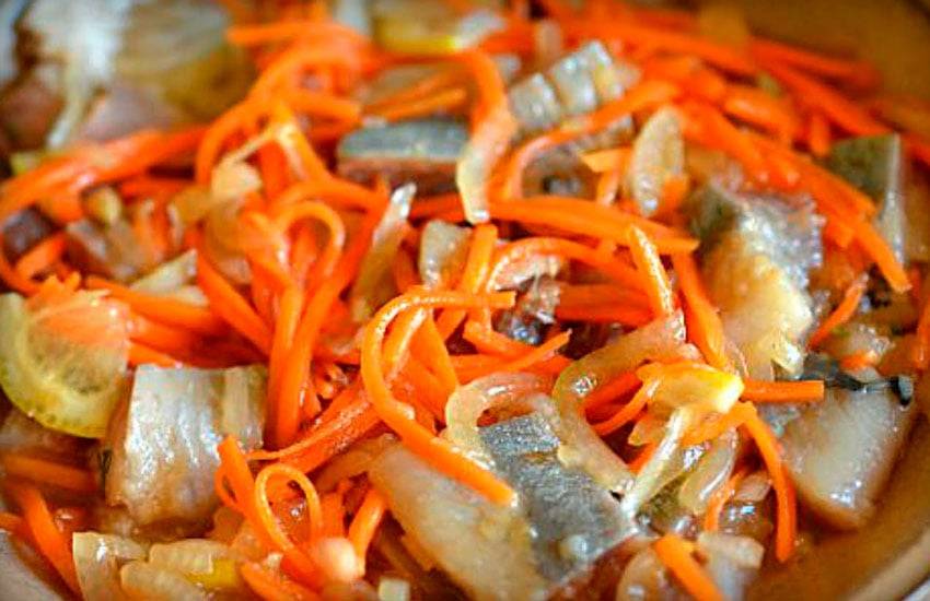 Овощи для хе режутся как можно тоньше, а время маринования зависит от величины рыбных кусочков