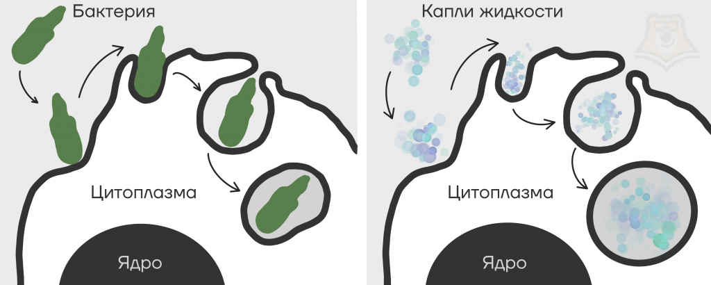 Простейшие-гетеротрофы могут поглощать жидкие компоненты среды (белки, липиды, растворенные углеводы) в виде капель. Такой способ питания называется пиноцитоз.