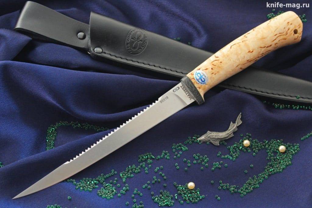 - Нож «Пескарь» – легкий прочный инструмент средних размеров. Острым лезвием легко разрезать любую рыбу. Клинок изготовлен из стали 95×18. Толщина клинка составляет 2,4 мм. Обух у острия приспущен.