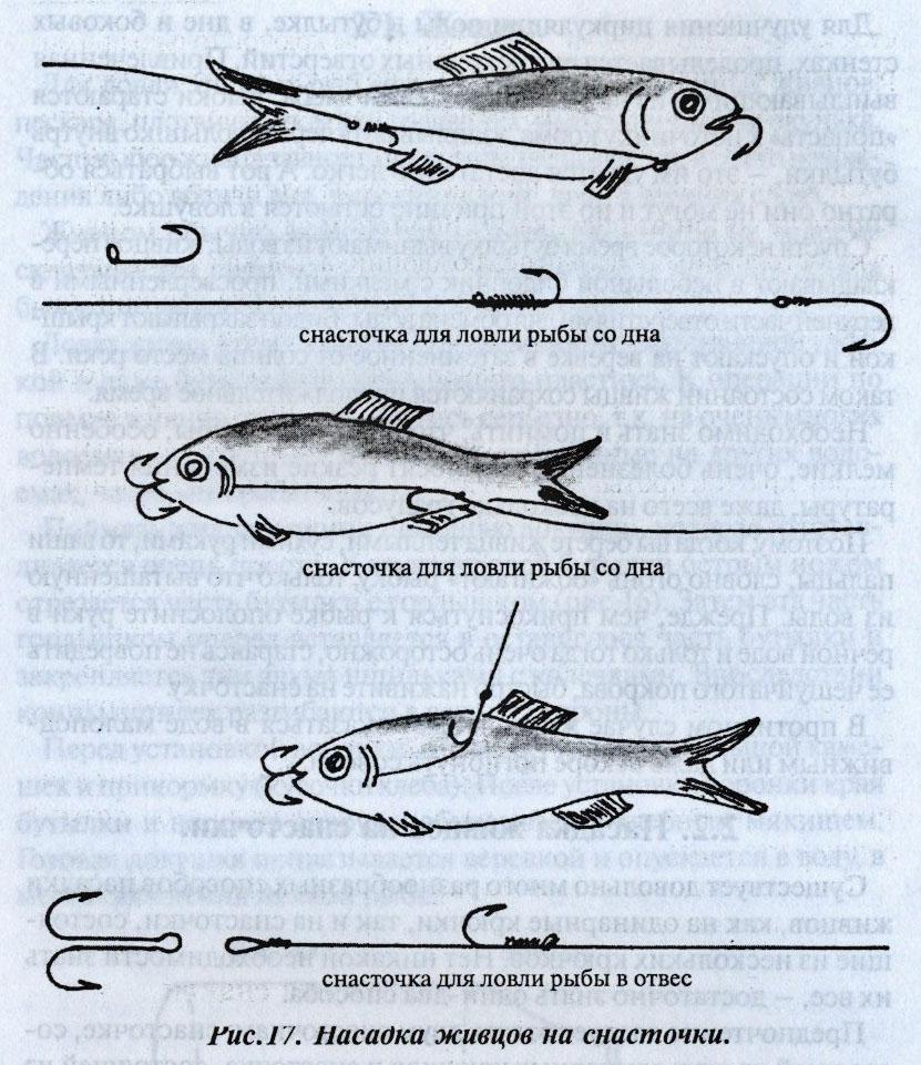 Насаживать живца можно разными способами. Но наиболее практично использовать сочетание одинарного крючка и двойника. Крючок свободно ходит по поводку и крепится к живцу в районе спинного плавника, а двойник одевается на поводок после продевания его через жабры живца.