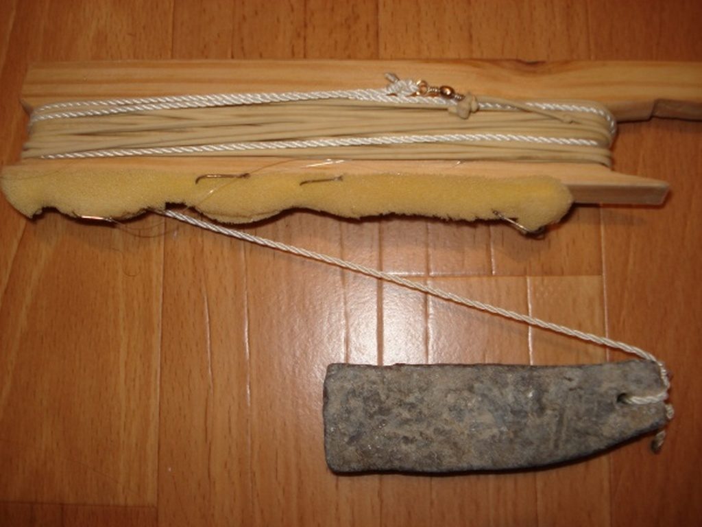 Эта снасть известна всем рыболовам и называется она «резинка». По сути – это донная снасть с резиновым амортизатором. Ее удобство в том, что не нужно постоянно вытаскивать всю снасть из воды, а лишь ее часть, где находятся крючки с насадкой. При этом ею удобно пользоваться, так как не приходится ее постоянно забрасывать. Дело в том, что крючки, при отпускании, сами под действием резинового амортизатора, уходят на глубину. К сожалению, она эффективна лишь на участках, где отсутствуют водоросли.