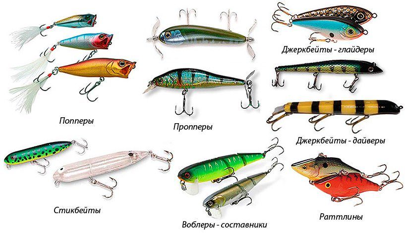 выглядит как простая палочка, и основное влияние на его уловистость оказывает умение рыбака изображать игру мелкой рыбешки. Лопастей не имеет. Поппер. В дословном переводе называется «кнопка», лопастей не имеет, зато нос у него срезан. Волкер. Дословно с английского – тот, кто гуляет, что и описывает поведение приманки. Она лишена лопастей и при подводке «гуляет» из стороны в сторону. Цикада. Имитирует мелкую дичь для хищника – жуков, мух, лягушек и грызунов, уловистость зависит от того, насколько точно рыбак может сымитировать с помощью приманки поведение жертвы. Проппер. Оснащенный лопастями в виде пропеллера, этот воблер крутится в воде, создавая небольшой водоворот и привлекая любопытных хищников.