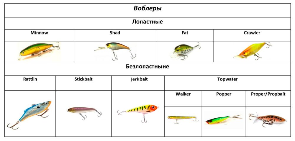 Наконец по конструкции, воблеры делятся на лопастные (минноу, шэд, фэд, крэнки, кроулеры) и безлопастные (попперы, стикбейты, раттлины, пропбейты, джеркбейты, волкеры).
