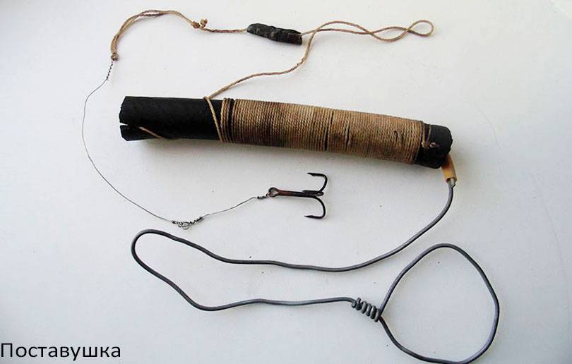 Чтобы сконструировать поставушки самостоятельно потребуется палка, которая будет играть роль распорки, устанавливаемой над лункой, и рогатина с намотанной на нее леской. Палка и рогатина между собой соединяются медной проволокой, чтобы утром была возможность продолбить лед в замерзшей лунке и не упустить добычу, так как простая леска при долблении может порваться. Рогатину можно заменить закидушкой.