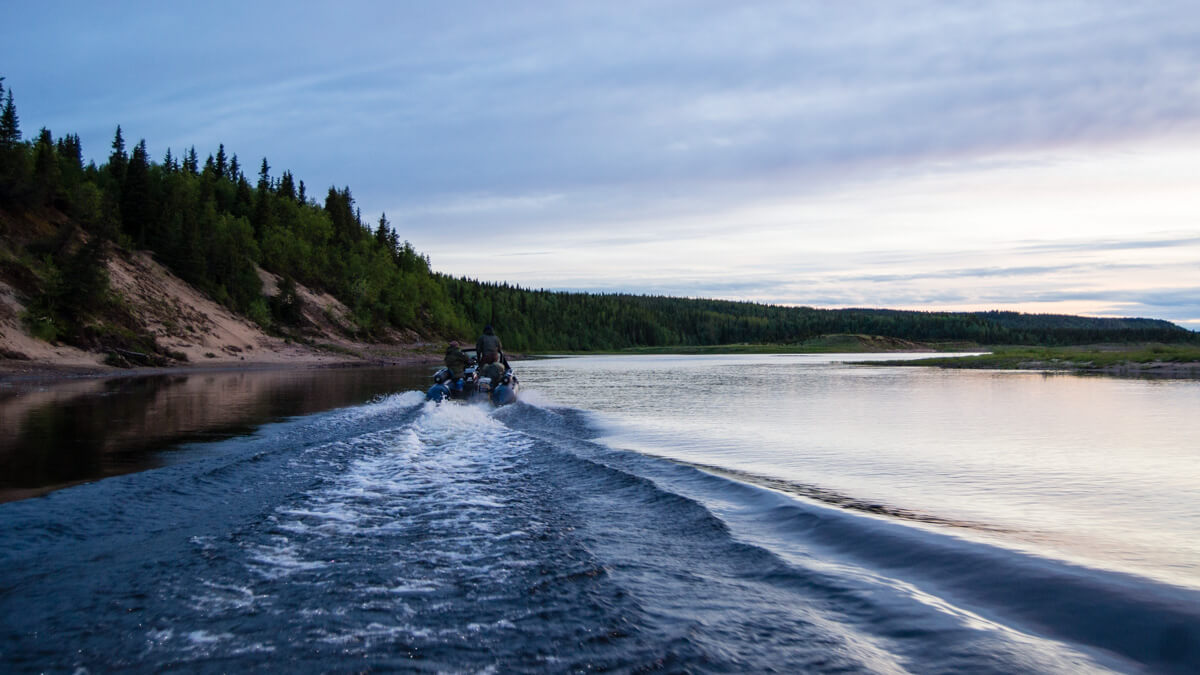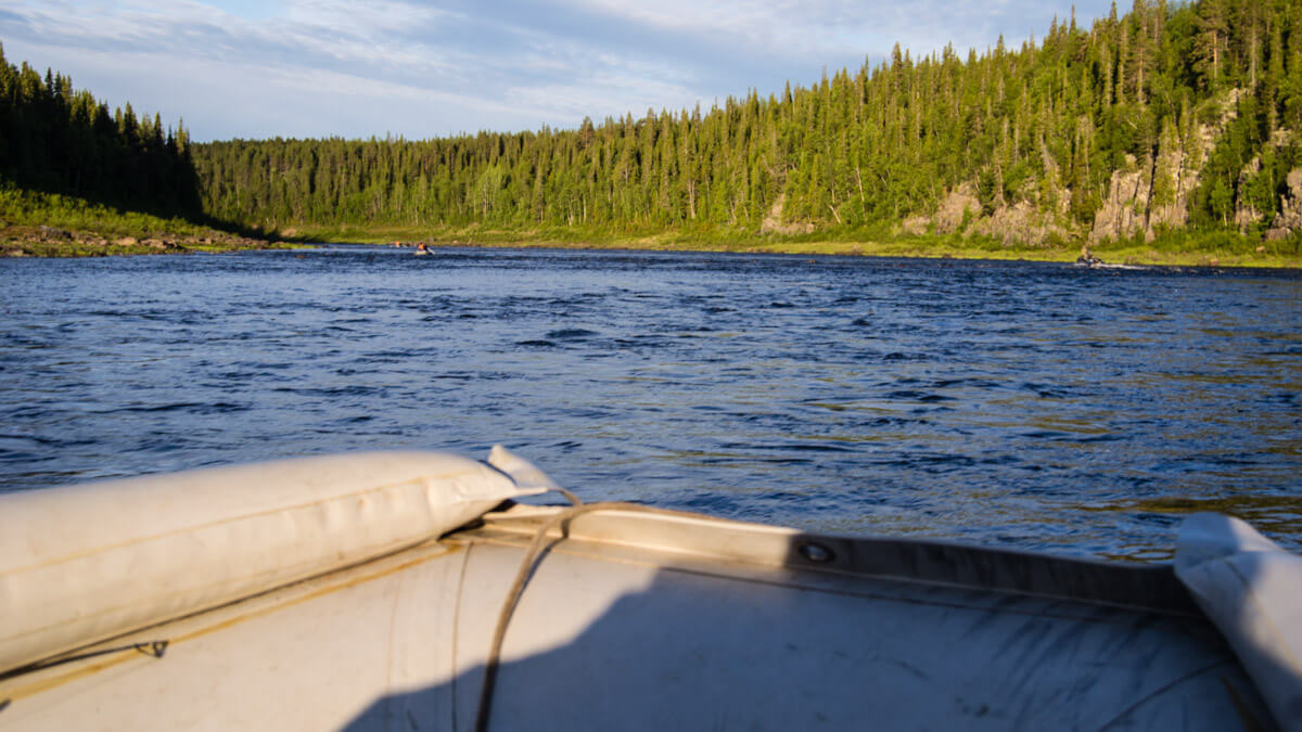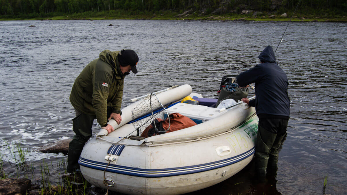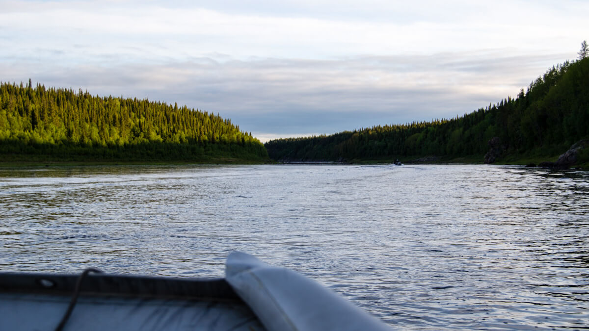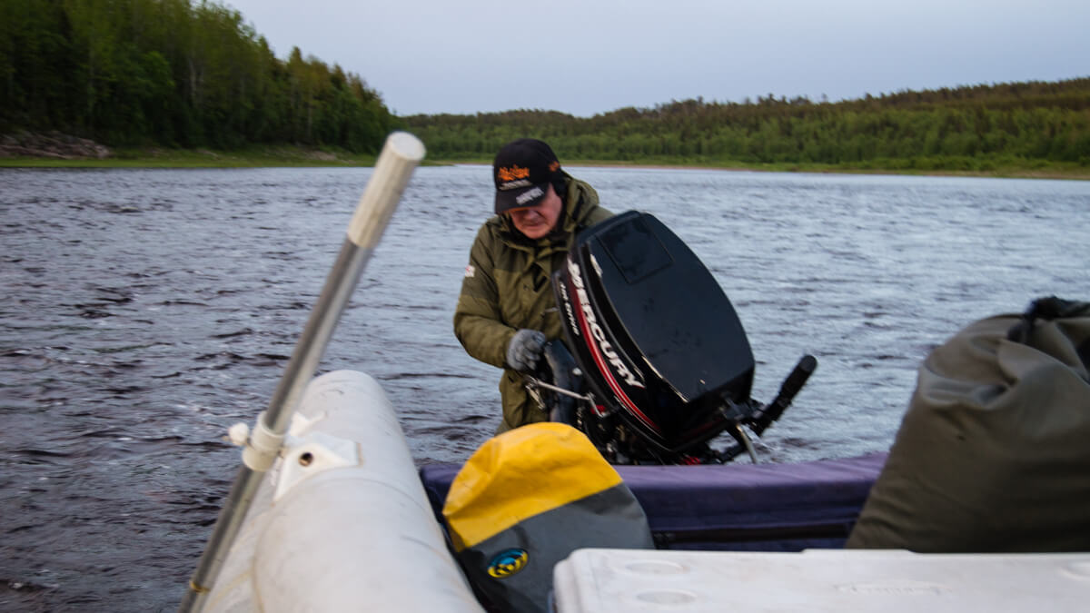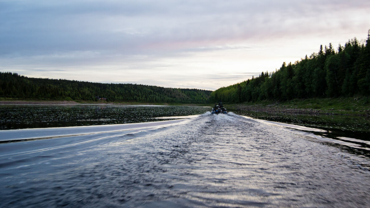Разбор двух лодок Solar 420, установка на них двух водометов Mercury по 25 л.с., упаковка вещей в гермомешки и приобретение лицензий занимает около часа, после чего, символически приняв «на ход ноги» и «за рыбалку», мы выдвигаемся вверх по реке: