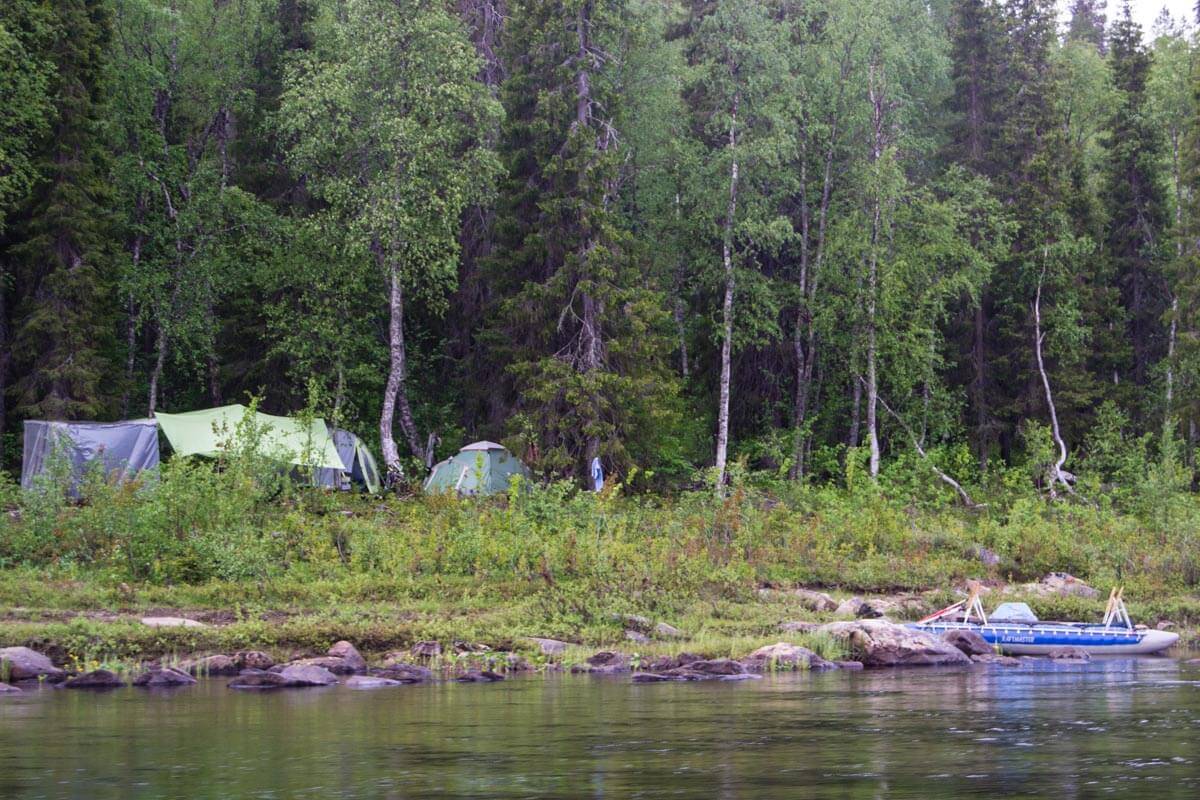 Андрей, управляющий ведущей лодкой, хорошо знает эти места, но обойти все пороги не удается — тащить будем много. Иногда встречаются редкие лагеря на берегу: