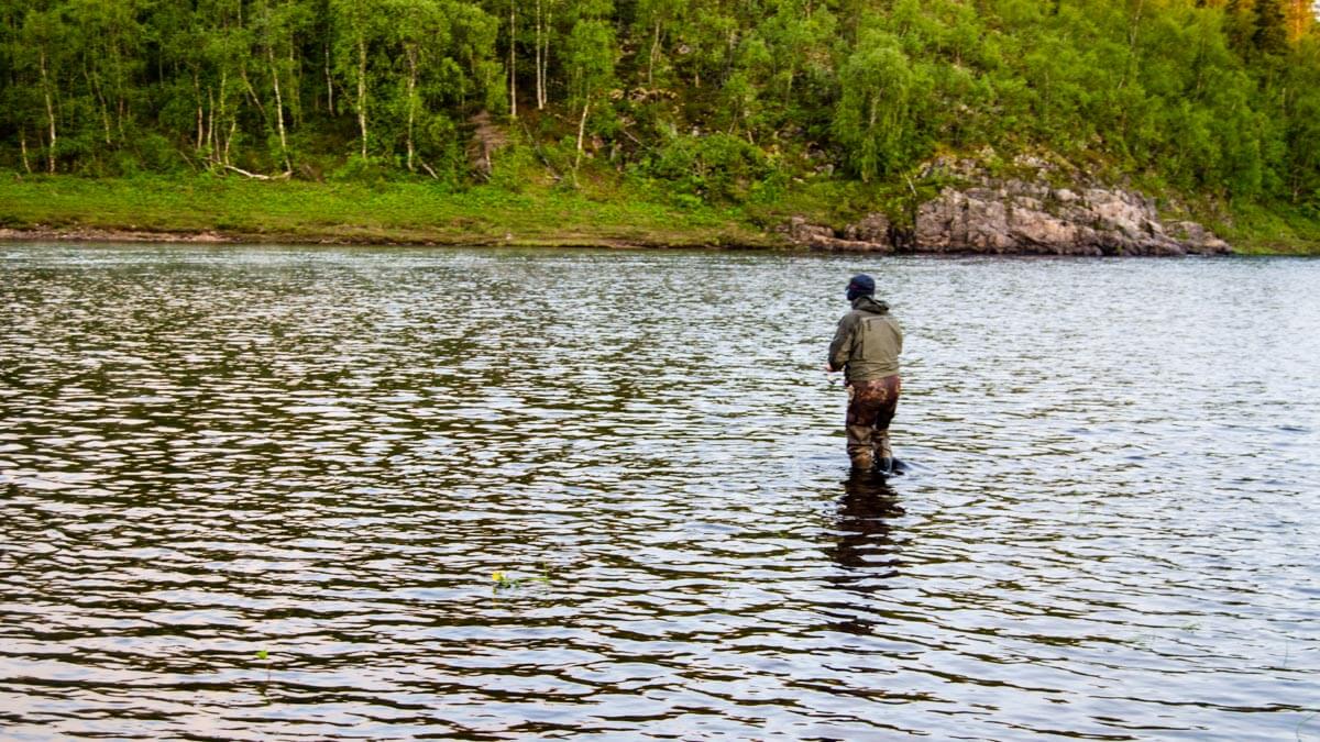 Делаем еще одну остановку и наш главный специалист по ловле семги, Андрей, тут же ловит первую Рыбу: