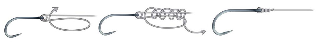 Данный метод является самым распространённым и достаточно практичным. С помощью него можно привязывать не только крючки, но и приманки, вертлюжки и ряд элементов оснастки.